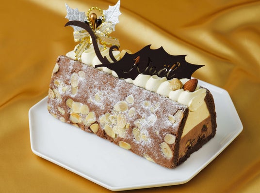 ショコラ生地に口どけのよいバナナムースとコクのあるショコラムース、濃厚なクレームショコラを重ねたクリスマスケーキ。ザクザクとした食感のナッツがアクセント。