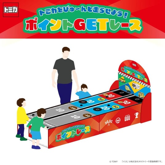 トミカをびゅーんと走らせて、止まったところのポイントを獲得できるアクティビティです。走らせるチャンスは3回。合計のポイント数に応じてもらえるアクリルキーホルダーの数が変わるので、力加減を調節して高得点を目指そう!