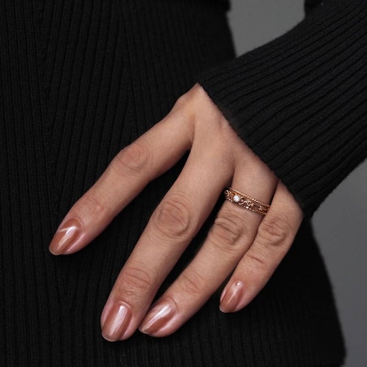 一本で着けると指先がすっきりと華奢に見え、同じナチュールシリーズとの重ねづけでは統一感を。細身の「Milgrain(ミルグレイン)」と合わせれば、デザインの奥行きが際立ち、ボリュームのある手元を演出します。