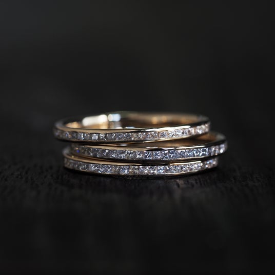 ロープのようなシルエットを一周に施したデザイン、小粒の石を一列に並べた繊細なタイプ、そしてしなやかに伸びるツタをかたどったリング。どれも控えめな中に個性が宿り、指先を美しく見せる仕上がりです。