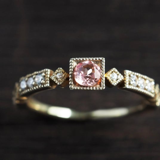 涙のしずくのように繊細で、淡い桜色が可憐なインペリアルトパーズ。シンプルな「Lieber Trad(リーベルトラッド)」のデザインが日常に寄り添い、肌の上で柔らかく輝きます。