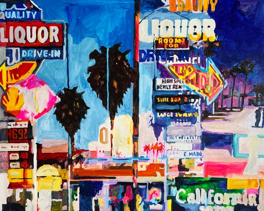 アメリカのロードムービーの1シーンのような画面にはデジタルで起こるバグ効果も描かれる。世界のどこにもない風景を色彩豊かに描く辰巳菜穂。Googleストリートビューにある世界中の街角の画像を収集し、アングルや時系列が違うカットをデジタルツールで重ね合わせ、油彩画を描いています。