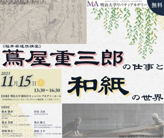 明治大学の生涯学習機関「明治大学リバティアカデミー」は、11月15日(土)に公開講座「蔦屋重三郎の仕事と和紙の世界《福井県連携講座》」を駿河台キャンパスで対面およびオンラインで開催します。事前予約制で、参加費は無料です。