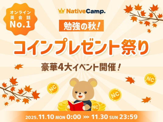 【英会話レッスン回数無制限】ネイティブキャンプ 秋の学びを応援!「勉強の秋!コインプレゼント祭り」開催 ~コインがもらえる豪華4大イベント~