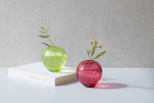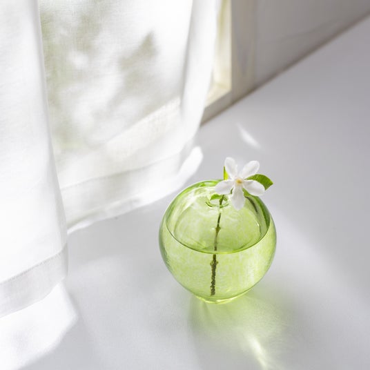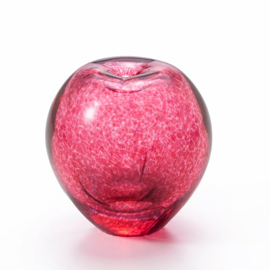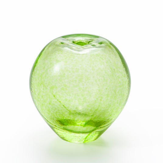 手吹きガラスならではのやわらかな色のゆらぎが、本物のりんごの果皮を思わせる風合いを生み出しています。やわらかな丸みや小さなくぼみなど、果実のフォルムを思わせる細部まで職人の手仕事が息づいており、花を挿しても、そのまま飾ってもインテリアに温もりを添えるアイテムです。