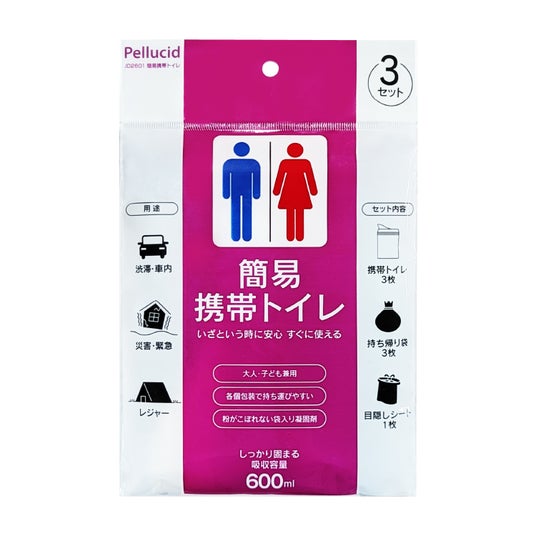 渋滞や災害など、もしもの時に備えていつでも安心コンパクトでカバンでの持ち運びに便利。1袋に3セットが入っており、車載用や災害時の備蓄・キャンプ・登山・海水浴などアウトドアでも活躍します。