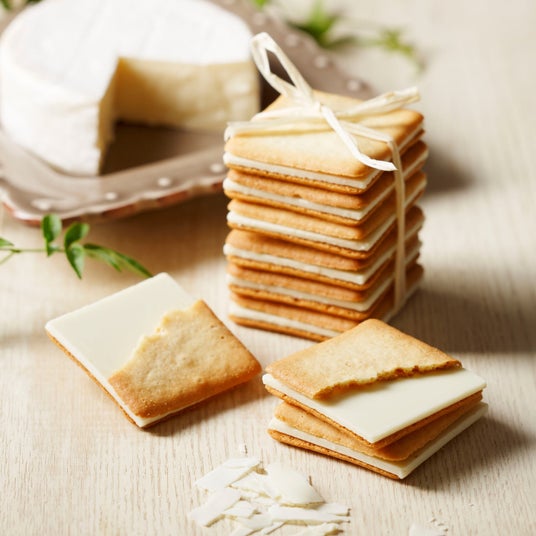 さっくり焼き上げたクッキーで、カマンベールパウダーを練り込んだホワイトチョコ※をサンド。チーズのほんのりとした塩味があとを引く、クセになるおいしさのクッキーです。