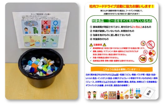 ISO14001(EMS:環境マネジメントシステム)の年間目標及び社会課題解決に向けたSDGsの取り組みとして、フードドライブ活動を継続するとともに、2025年度は、ペットボトルキャップの回収・リサイクルを推進する「エコキャップ活動」に取り組んでまいります。