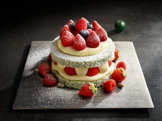 オーストラリアの伝統菓子をアレンジした華やかなケーキです。ピスタチオ風味のチョコレートソースを染み込ませたスポンジと、カスタードクリーム、クロテッドクリームを合わせたクリームを使用しています。