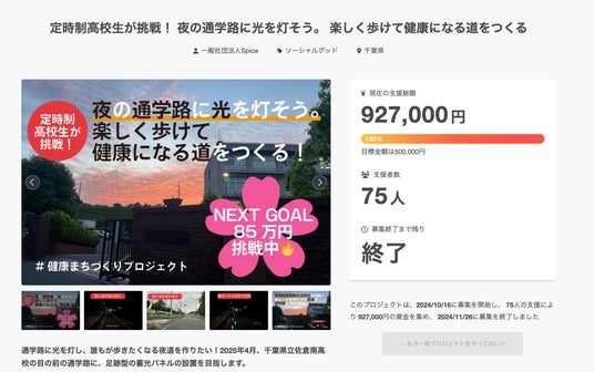 このアイディアを実現するために、一般社団法人Spiceがクラウドファンディング実施事務局として、2024年10月16日よりクラウドファンディングを開始いたしました。合計で75名の方々より、目標金額の185%である927,000円を達成しております。