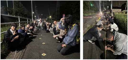 2025年1月の最終デザインの検討と決定の授業では、実際に蓄光パネルを設置する距離を測り実際に歩く人たちのことを想像しながら、設置箇所の検討を行い、工夫をこらしながら設置する場所を決めました。21:00からの放課後の時間を使い、約14日かけて設置作業を実施しております。