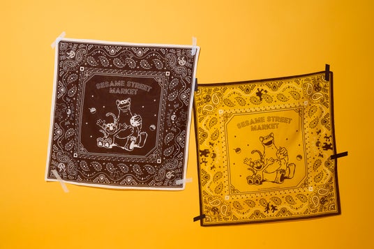 トラのコスチューム姿になったエルモとクッキーモンスター、たこ焼きなど、大阪ならではのモチーフをたっぷりと詰め込んだデザインのバンダナ。