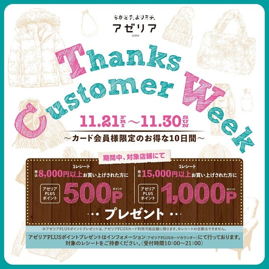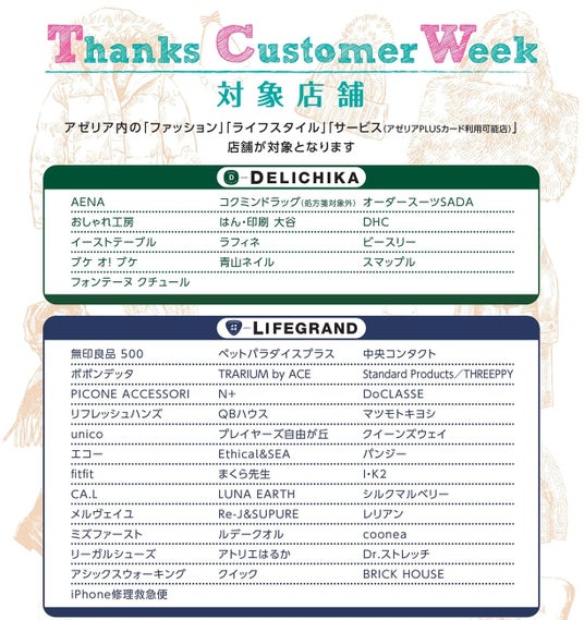 期間中、ファッション・ライフスタイル・サービスの対象店舗でお買い物されたお客様にお買い上げ金額に応じてアゼリアPLUSポイントをプレゼントいたします。