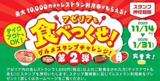 アゼリア内の各レストランで1,000円(税込)以上の店内でのご飲食、またはテイクアウトされたお客様にスタンプを押印いたします。スタンプ獲得数に応じて最大10,000円分(※)のレストラン利用券をプレゼントいたします。