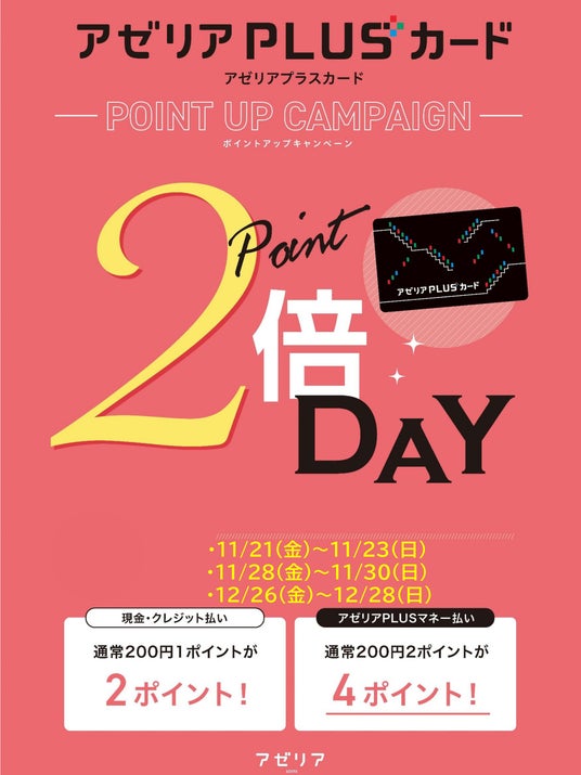 開催期間:11月21日(金)~11月23日(日)、11月28日(金)~11月30日(日)、12月26日(金)~12月28日(日)アゼリアPLUSポイントが通常の2倍付与されるポイントアップキャンペーンを開催いたします。