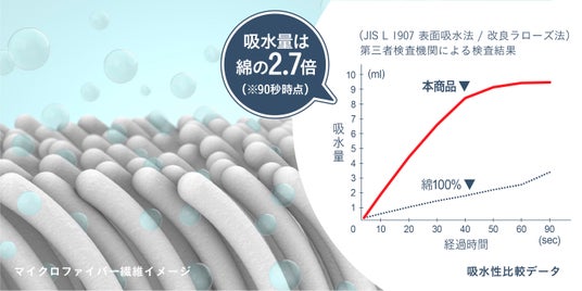 綿素材の約2.7倍の吸水力を発揮(第三者検査機関調べ/JIS L 1907試験)。