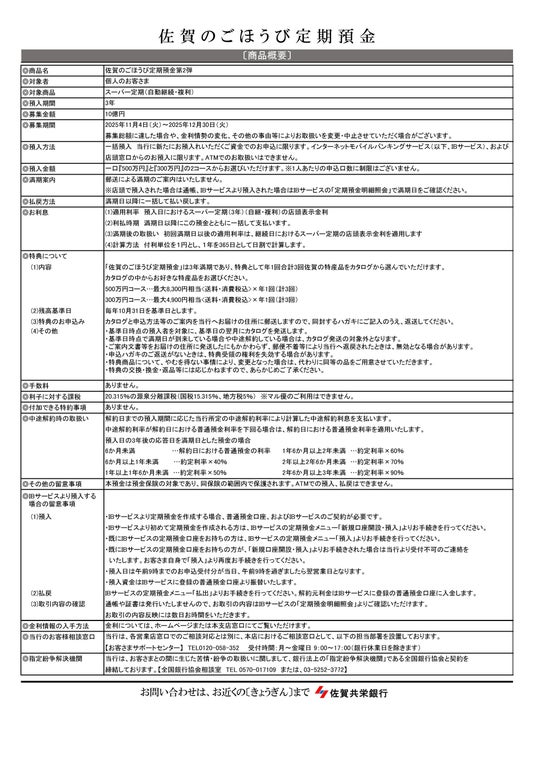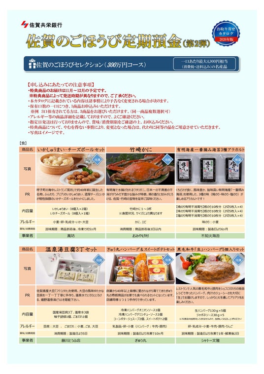 佐賀共栄銀行(本社:佐賀県佐賀市、頭取 二宮 洋二)は、佐賀県の名産品を全国へ届けるキャンペーン「佐賀のごほうび定期預金」につきまして、多くのお客様よりご好評をいただいたことから、「佐賀のごほうび定期預金第2弾」の取り扱いを開始いたします。