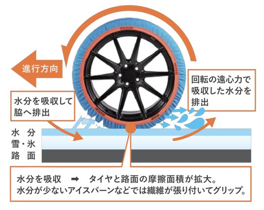 タイヤが雪に接触すると雪が瞬時に溶け、水膜が発生します。この水膜がスリップの主な原因となります。イッセ・スノーソックス リサイクルは、強い繊維を束ねた「より糸」を立体的に編み込み、しっかりとした厚みをもたせています。この構造が路面の水分を素早くキャッチし、外側へと排出することでグリップ力を回復させます。