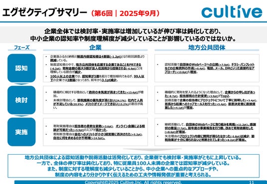 今後、さらなる企業版ふるさと納税の普及とそれによる地方創生を目指すために、自治体側と企業側、それぞれの立場における実態を可視化し市場変化をとらえることが必要不可欠であると考えており、カルティブでは市場形成における正確な定点調査のため、制度改正があった2020年度より毎年調査を実施しております。
