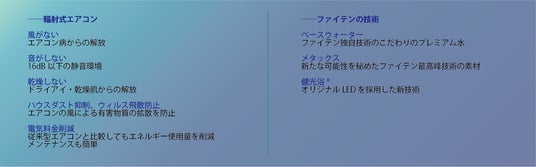 本システムは、ファイテン独自の「アクアチタン」技術を組み合わせ、快適な温熱環境とリラクゼーション効果を両立した新しい空調体験を提供します。