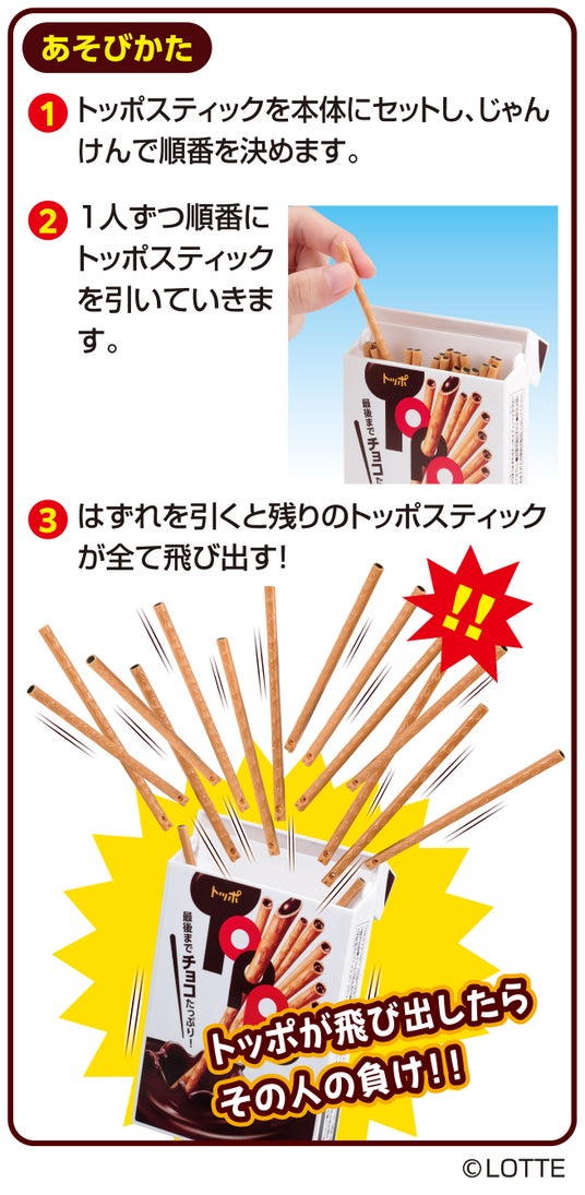 スティックを1本ずつ引き抜いていき、外れを引いたらトッポが飛び出す!その瞬間、負けが決定!