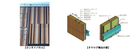 大和ハウス工業と大和ハウスグループの株式会社フジタ(本社:東京都渋谷区、社長:奥村洋治)、株式会社芳賀沼製作(本社:福島県南会津郡、社長:芳賀沼克紀)が開発した間伐材耐火外壁「カンタイパネル」は、中高層建築物向けの木質系カーテンウォール(※3)です。木質系カーテンウォールとして、日本初(※4)の60分の耐火大臣認定を取得しました。樹種により強度が不安定で建材としての活用が難しかった間伐材を、外壁パネルの強度を高める「タテログ構法」を採用することで、地域の製材所でも加工可能な構造材として再生。環境負荷の低減を推進し、地域資源の新たな価値創出に貢献します。
