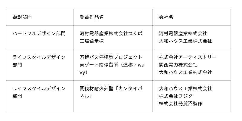 大和ハウス工業株式会社(本社:大阪市、社長:大友 浩嗣、以下、「大和ハウス工業」)は、当社が設計・施工した「河村電器産業株式会社つくば工場食堂棟」「万博バス停建築プロジェクト 東ゲート南停留所(通称:wavy)」、当社と当社グループの株式会社フジタ(本社:東京都渋谷区、社長:奥村洋治)、株式会社芳賀沼製作(本社:福島県南会津郡、社長:芳賀沼克紀)が開発した間伐材耐火外壁「カンタイパネル」の3作品において、「ウッドデザイン賞2025」(※1)を受賞しました。これにより、当社は同賞6度目、累計9作品の受賞となります。