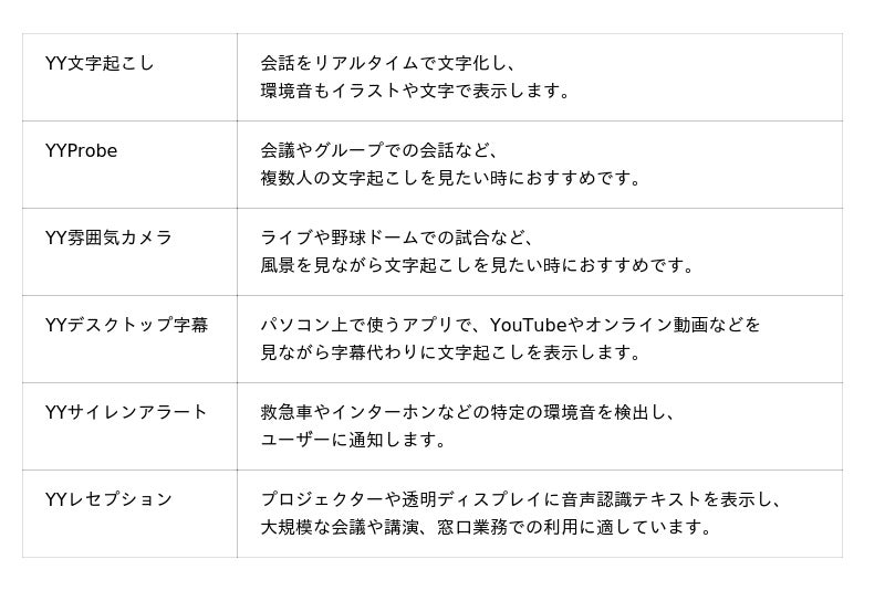 「YYSystem」とは、主に聴覚障がいのある方を対象に、声や音を可視化する独自のアルゴリズムをコアとして「意思疎通支援」を行うアプリケーションシリーズです。「いつでも、どこでも、誰とでも会話ができる」「生活環境音を可視化できる」という特長を活かし、聴覚障がいのある方がコミュニケーションで取り残されない、安心して暮らせる社会を実現します。