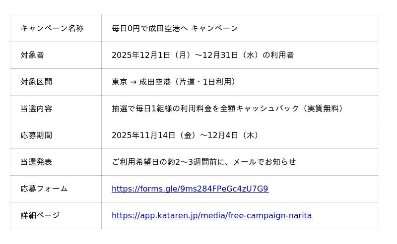 ・本キャンペーンは「東京→成田空港」の片道利用が対象です。