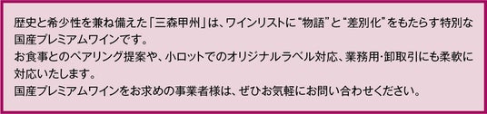 歴史と希少性を兼ね備えた「三森甲州」は、ワインリストに“物語”と“差別化”をもたらす特別な国産プレミアムワインです。