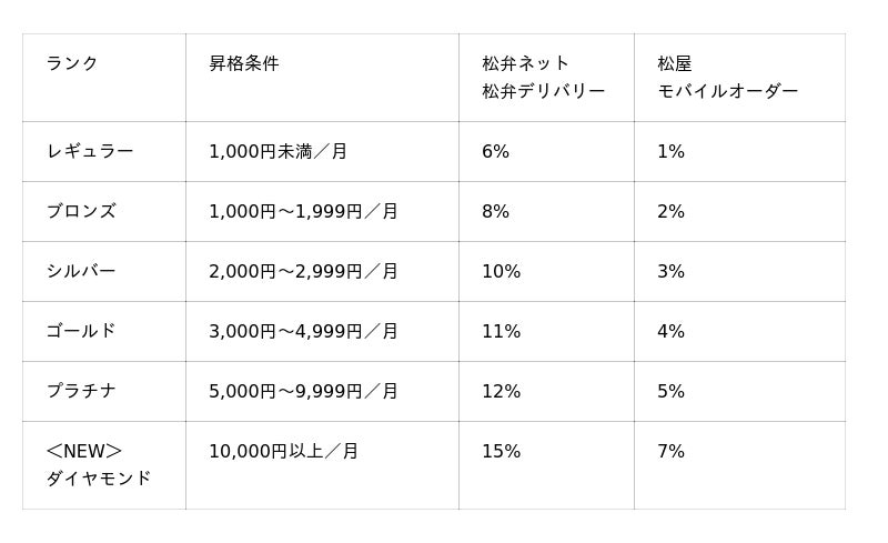 このたび松屋フーズ(本社:東京都武蔵野市、代表取締役社長:瓦葺一利)では、松屋公式アプリにて、12月1日(月)より、会員ランク制度に「ダイヤモンドランク」を新設いたします。
