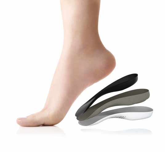 アプリの解析結果と連動し、着用時の姿勢のゆがみをサポートするインソール。ゆがみのタイプに合わせて選べる3種をラインアップ。適度な硬さとしなやかさを両立する3層構造で、着用時に土踏まずのアーチや、かかとの軸を補整します。