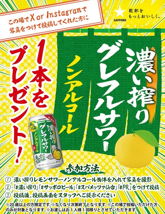 さらに、その場でXまたはInstagramに写真を投稿いただいた方には「サッポロ 濃い搾りグレフルサワー ノンアルコール」(注1)も1本プレゼントいたします。