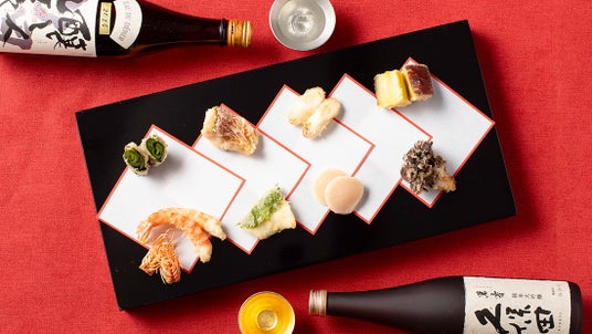 前菜と祝肴を含む天ぷらコース。甘鯛や車海老などの魚介と、埼玉県産の小松菜や舞茸などの旬野菜を熟練の技で仕上げます。お勧めのお酒とのペアリングもお楽しみください。