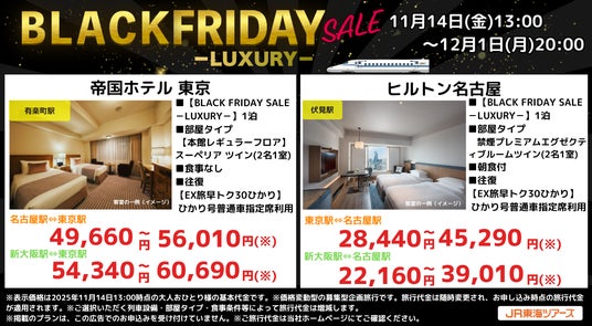 株式会社ジェイアール東海ツアーズ(本社:東京都中央区、以下JR東海ツアーズ)は、2025年11月14日(金)から12月1日(月)までの期間限定で「BLACK FRIDAY SALE」を開始いたしました。1月以降出発の「新幹線+ホテル」を期間限定の衝撃価格でご予約いただけます。コスパ重視のホテルから憧れのラグジュアリーホテルまで多彩なラインナップからお選びください。一年に一度のお祭りセールで新幹線旅行をおトクに予約できるこの機会をお見逃しなく!