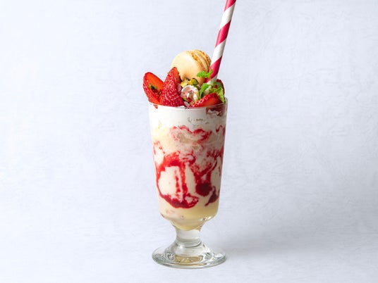 ROIROMおふたりの出身地の県花「やまゆり」(神奈川県)と「デイゴ」(沖縄県)をイメージした、華やかで可憐なカスタードシェイク。スポンジケーキやラズベリーソースを重ね、いちごとマカロンで彩った見た目も楽しいスイーツです。
