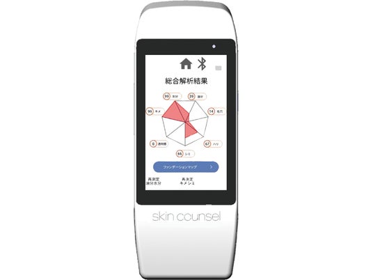 <コスメデコルテ>年代別でわかる肌コンディション・内容:ハンディ機器「スキンカウンセルV」で油分・水分・毛穴など8項目をチェックします。 蓄積データと年代別比較で、自分の肌状態が一目でわかります。