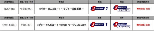 また、リーグワン開幕企画として、「ラグビー わんだほー! 特別編 リーグワンのミカタ」を12月14日(日)に放送・配信します。「ラグビーわんだほー!」メンバーがラグビーを初めて見る方やこれからリーグワンを見てみたい方に向けてラグビーのルールからリーグワンの魅力、注目選手たちをわかりやすく、楽しみ方まで余すことなくお伝えします。