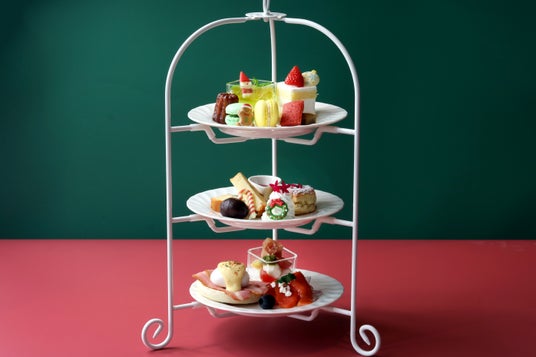 - 内容:苺のショートケーキ、青りんごゼリー、カヌレ、マカロン、スコーン、栗のパウンドケーキ、エッグベネディクト、スモークサーモン、カプレーゼなど、スイーツとセイボリーのセット