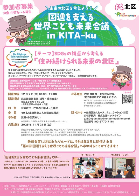 一般財団法人ピースコミュニケーション財団は、東京都北区の小学校に通う4~6年生を対象にした「国連を支える世界こども未来会議 in KITA-ku」を北区役所第一庁舎にて開催します。
