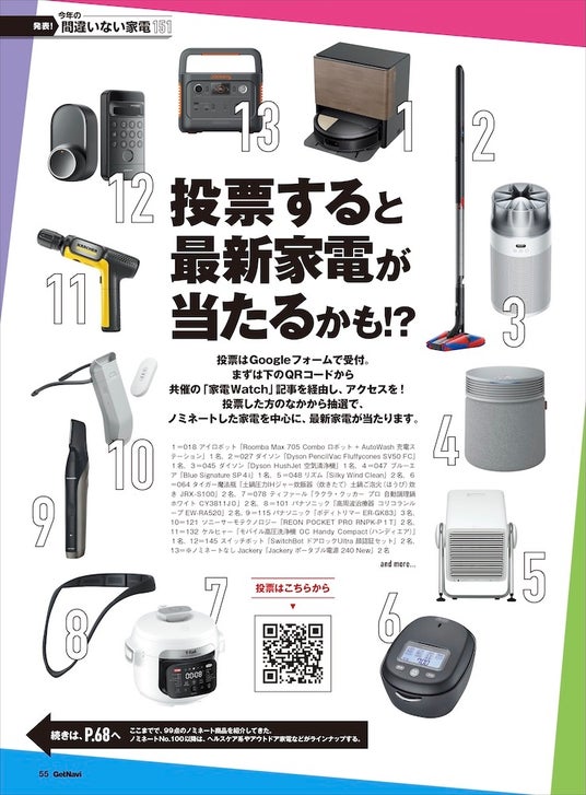 ↑プレゼントラインナップ。共催する月刊モノトレンド誌『GetNavi(ゲットナビ)』2026年1月号(2025年11月21日発売)の家電大賞特集より。