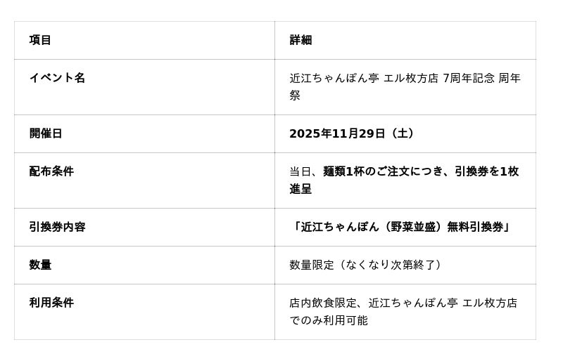 2018年の開店以来、エル枚方店は「野菜たっぷりのやさしい近江ちゃんぽん」を通じて、枚方エリアの皆さまの健康と食生活を支えてきました。この7年間のご愛顧への感謝を込めて、周年祭当日は特別なプレゼントを実施いたします。