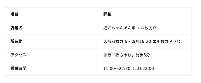 「いつも近江ちゃんぽん亭 エル枚方店をご利用いただき、誠にありがとうございます。この7年間、地域の皆さまの温かいご支援に支えられ、店舗を続けてこられました。これからも、『野菜たっぷりのやさしい近江ちゃんぽん』 で、枚方の皆さまの毎日に寄り添うお店であり続けます。スタッフ一同、周年祭当日のご来店を心よりお待ちしております。」
