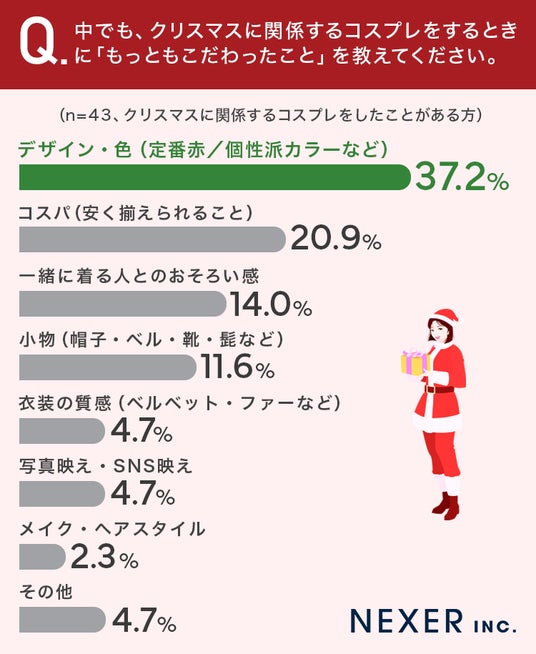 ■46.5%が、クリスマスに関係するコスプレをするときにこだわったことは「デザイン・色」