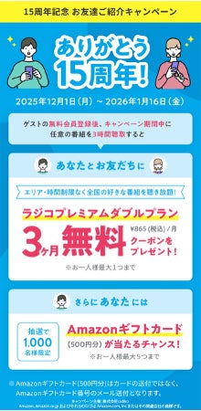 友だち紹介キャンペーンをスタートします。既存ユーザーがアプリ内のリンク『友達紹介はこちら』から特典コード発行URLを取得し、友人にURLをシェア。紹介した友人がradikoアプリにログインして合計3時間以上番組を聴取すると、紹介者と友人双方にラジコプレミアム(ダブルプラン)クーポン3か月分をプレゼント。さらに紹介者には抽選で1000名様にAmazonギフトカード500円分※2)をプレゼントします。radikoの輪を拡げ、radikoの魅力をもっと多くの方に知ってもらおうと、本日12月1日から紹介した人も紹介された方もお得なキャンペーンです。