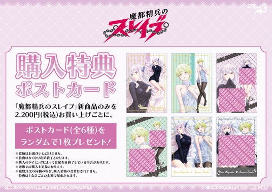 『魔都精兵のスレイブ』の新商品のみを1会計2,200円(税込)お買い上げごとに、特典ポストカード(全6種)をランダムで1枚プレゼント。特典はなくなり次第配布終了となるので、新作グッズとあわせて早めにゲットしてください!