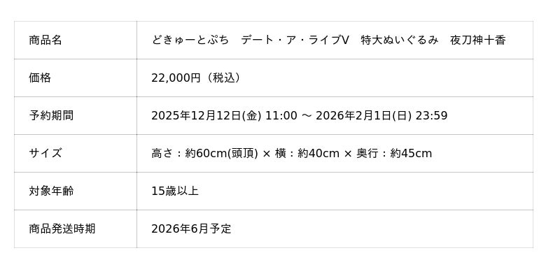 株式会社タイトー(本社:東京都新宿区、以下タイトー)は、特大ぬいぐるみブランド「どきゅーとぷち」の新商品として、『どきゅーとぷち デート・ア・ライブV 特大ぬいぐるみ』の予約販売を決定しました。ECサイト「TAITO GEAR&GOODS」(URL:https://taito-goods.jp/shop/default.aspx)にて、2025年12月12日(金) 11:00より「夜刀神十香」「時崎狂三」の予約受付を開始します。
