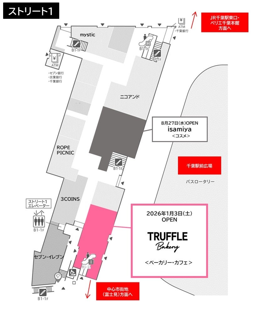 JR千葉駅中央改札にほど近いエントランスに直結する本館4F北ゾーンには、千葉県初となるティービバレッジを楽しむ新店舗「スターバックス(ティー&カフェ)」(2025年12月24日)、再開発が進む千葉市中心市街地との結節点であるストリート1には、全国3店舗目となるパンとカフェが融合したカフェ業態「TruffleBAKERY(トリュフベーカリー)」(2026年1月3日)がオープンします。
