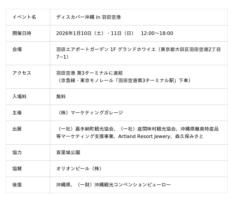 2026年1月10日(土)・11日(日)の2日間、羽田エアポートガーデン(東京都大田区)にて、沖縄の地域PRを目的としたイベント「ディスカバー沖縄 in 羽田空港」を開催します。