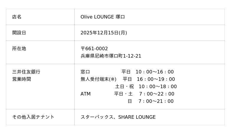 株式会社三井住友銀行(頭取 CEO:福留 朗裕、以下「三井住友銀行」)は、2025年12月15日に、三井住友銀行と三井住友カードの共同商品「Olive(オリーブ)」をモチーフとした新しいコンセプトの個人のお客さま向け店舗「Olive LOUNGE(オリーブ ラウンジ)塚口」を開設することを、お知らせいたします。銀行とスターバックス、SHARE LOUNGEが一体になった店舗として、多様な人が心地よく過ごせる場を目指します。